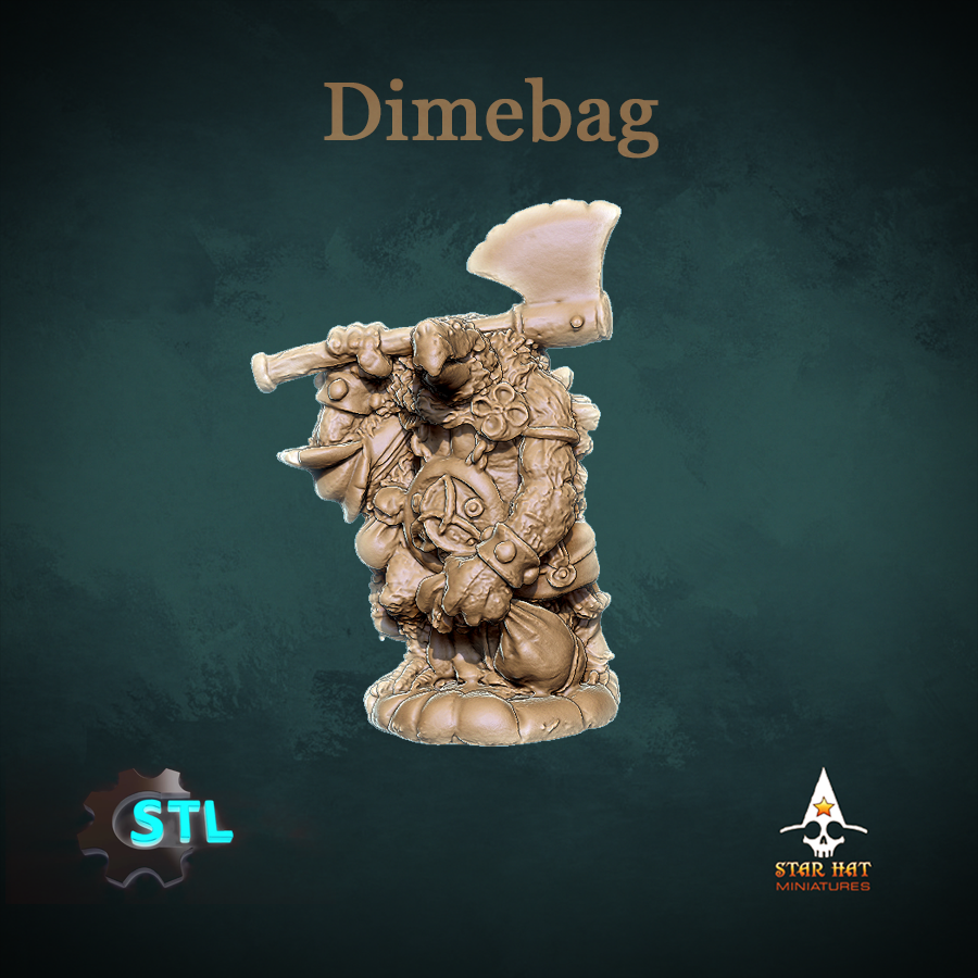 Dimebag is 28mm toe-to-eye, downloadable STL for 3D printing, with an integrated cobblestone base and a baseless version supplied in the zip. All miniatures are supplied unpainted.