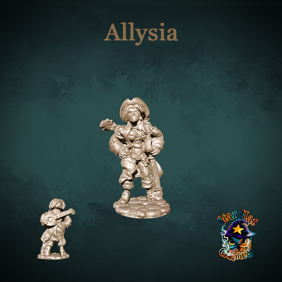 Allysia is 32mm toe-to-eye, downloadable STL for 3D printing, with an integrated cobblestone base and a baseless version supplied in the zip. All miniatures are supplied unpainted.