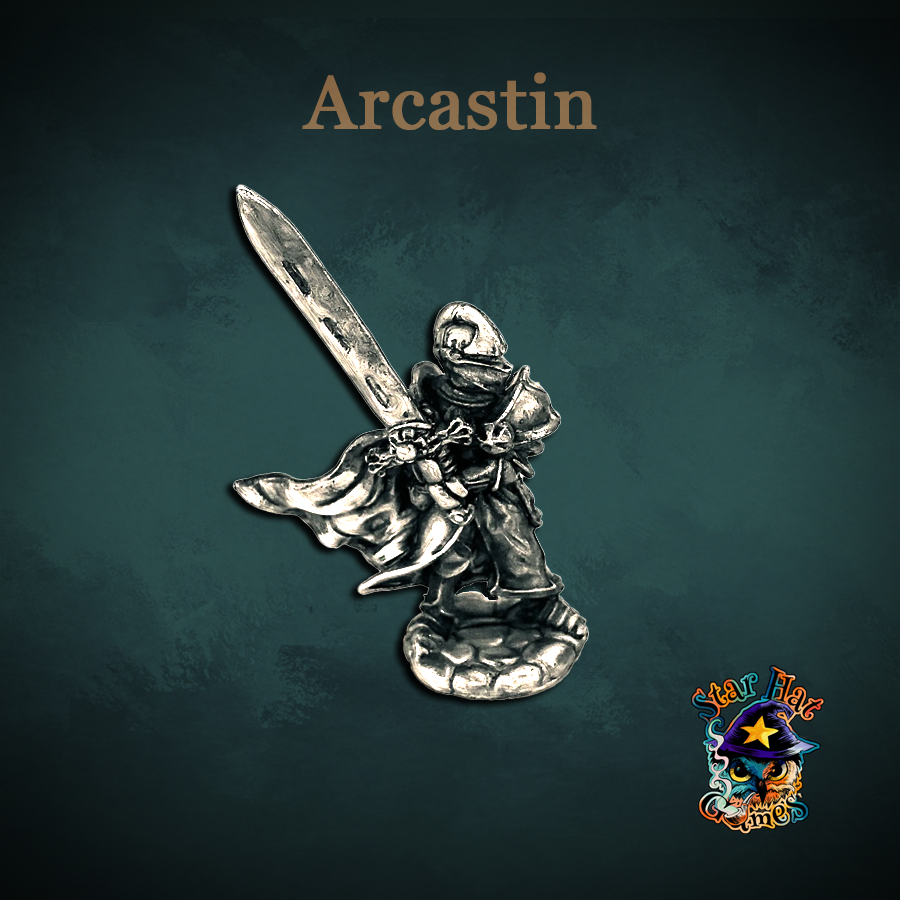 Arcastin is 34mm toe-to-eye, downloadable STL for 3D printing, with an integrated cobblestone base and a baseless version supplied in the zip. All miniatures are supplied unpainted.