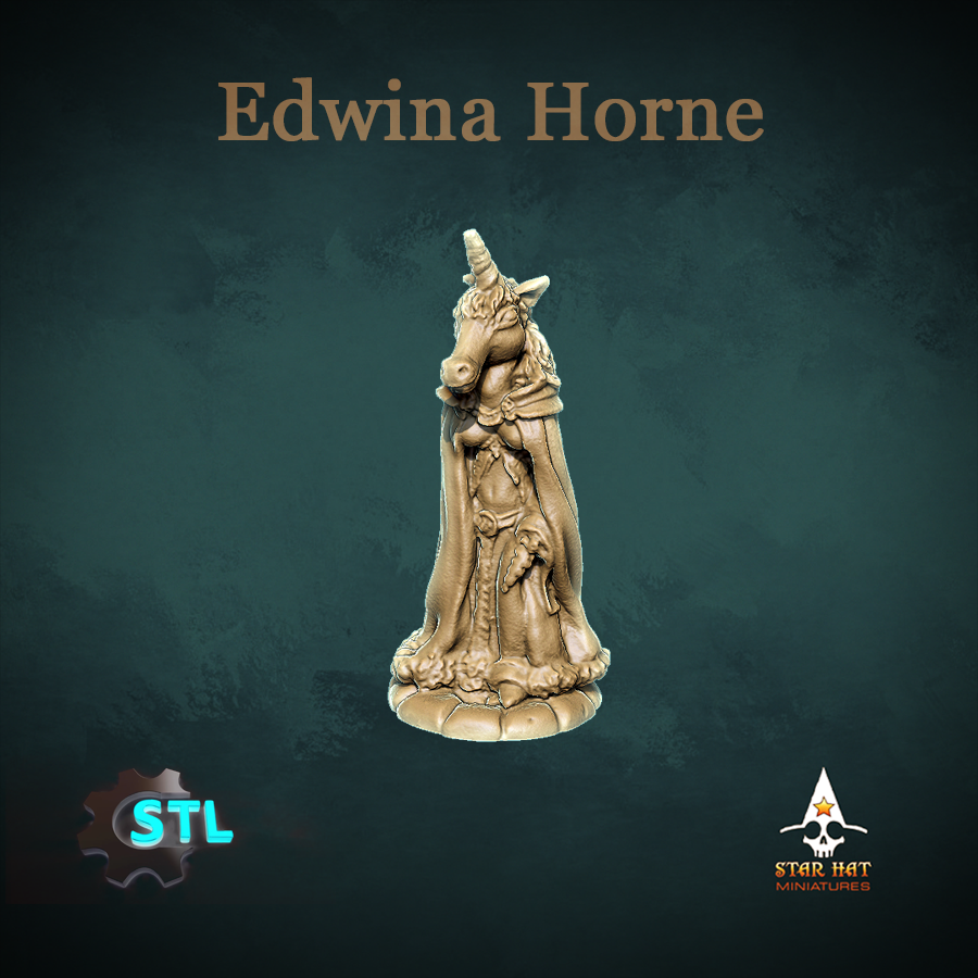 Edwina is 37mm toe-to-eye, downloadable STL for 3D printing, with an integrated cobblestone base and a baseless version supplied in the zip. All miniatures are supplied unpainted.
