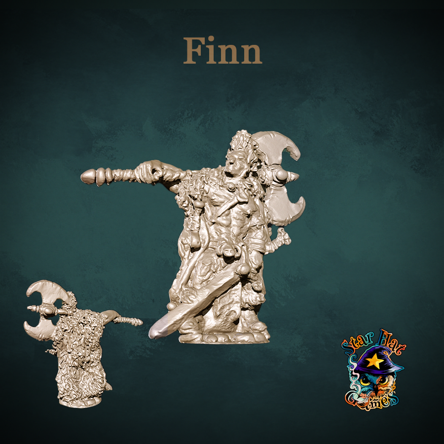 Finn is 38mm toe-to-eye, downloadable STL for 3D printing, with an integrated cobblestone base and a baseless version supplied in the zip. All miniatures are supplied unpainted.