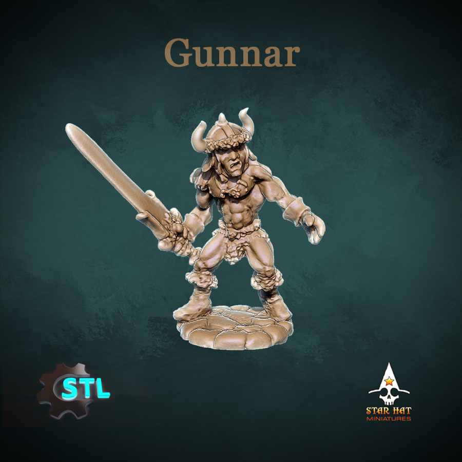 Gunnar is 33mm toe-to-eye, downloadable STL for 3D printing, with an integrated cobblestone base and a baseless version supplied in the zip. All miniatures are supplied unpainted.