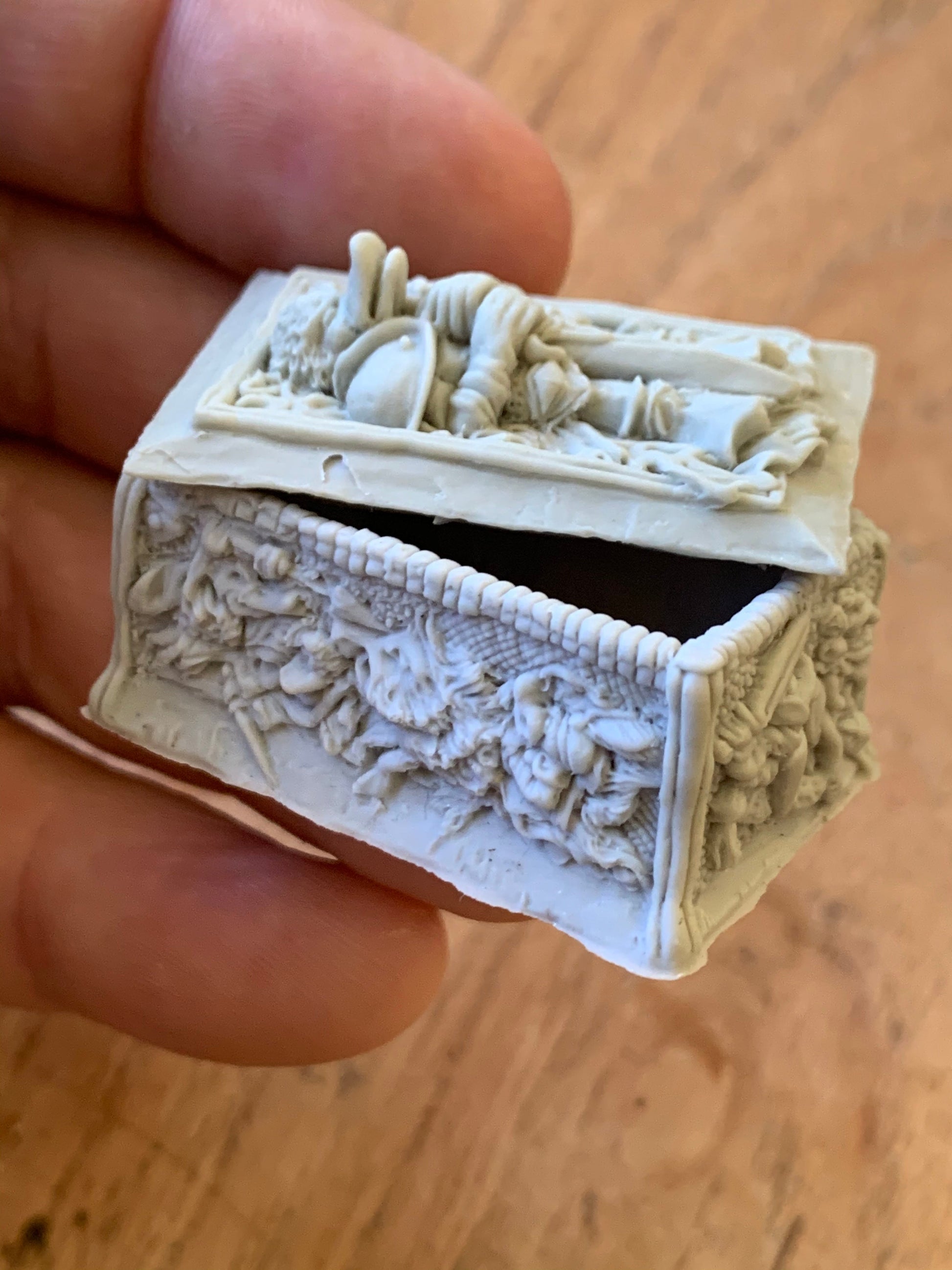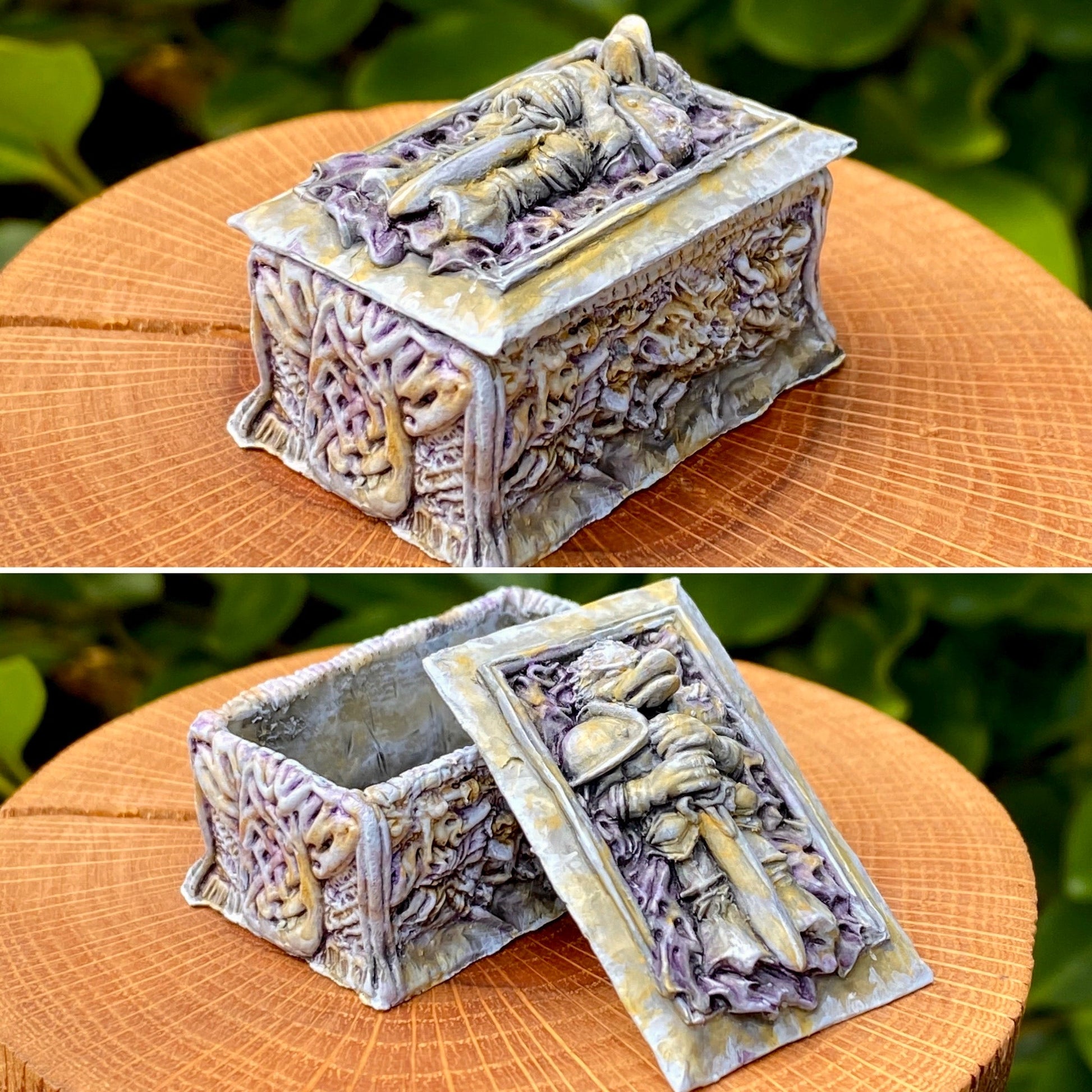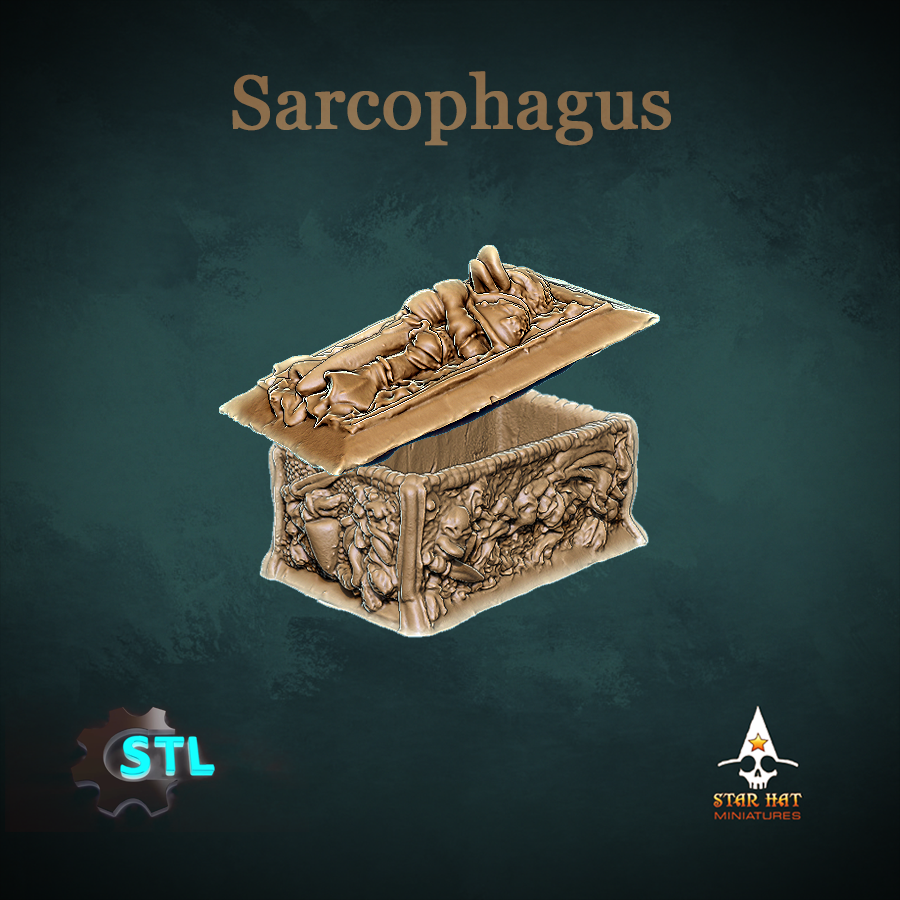 The sarcophagus is 28mm in height and width by 42mm in length. This is a downloadable STL for 3D printing, with a coffin and lid supplied in the zip. Supplied unpainted.