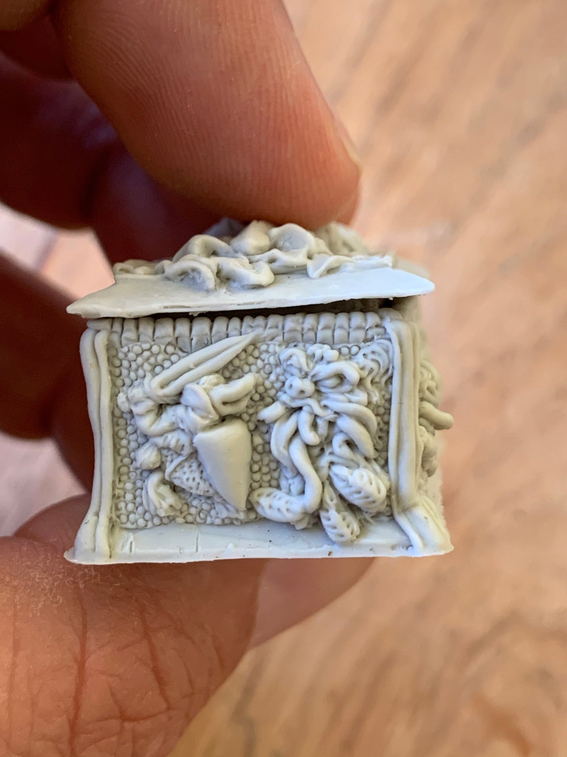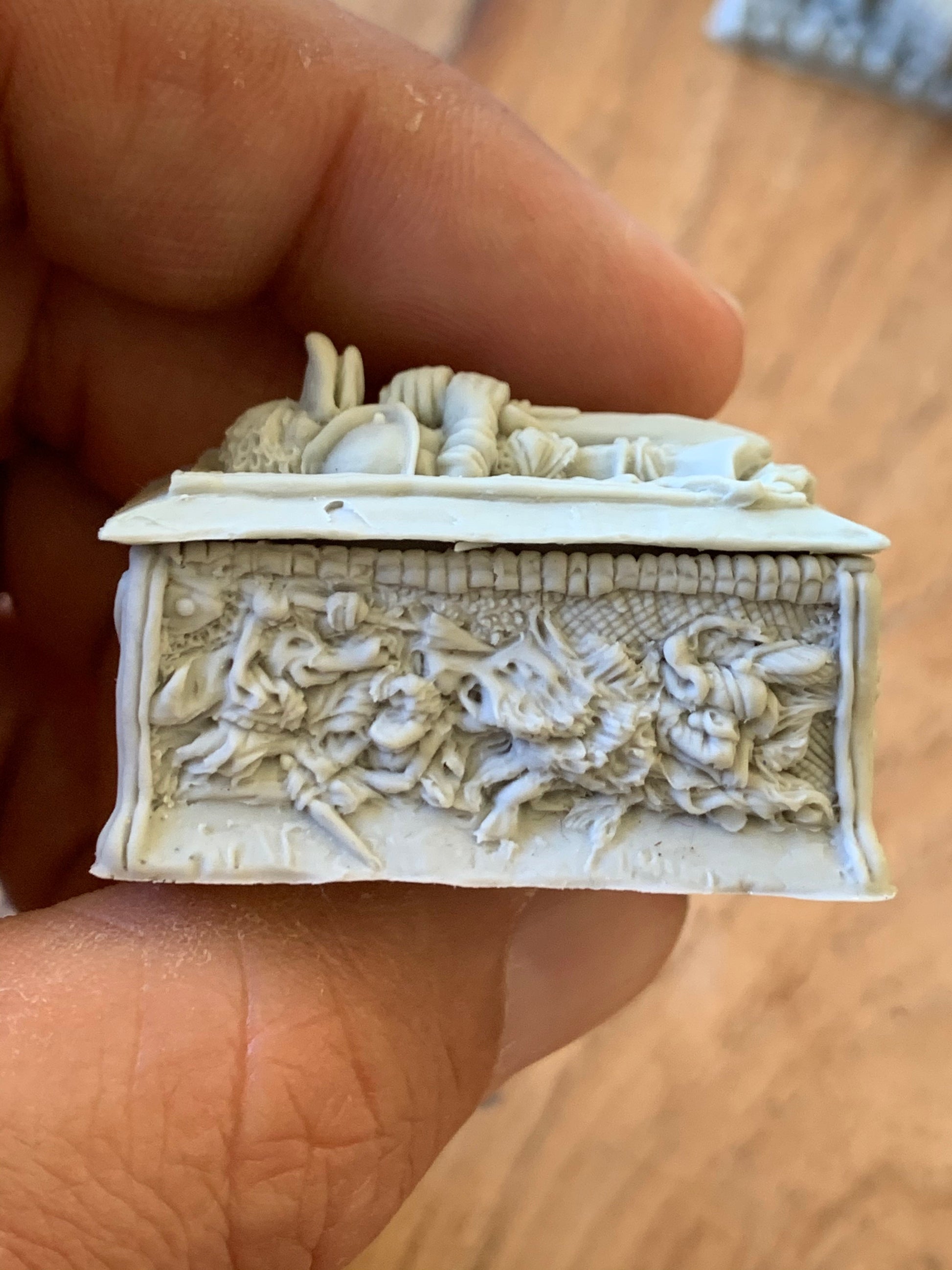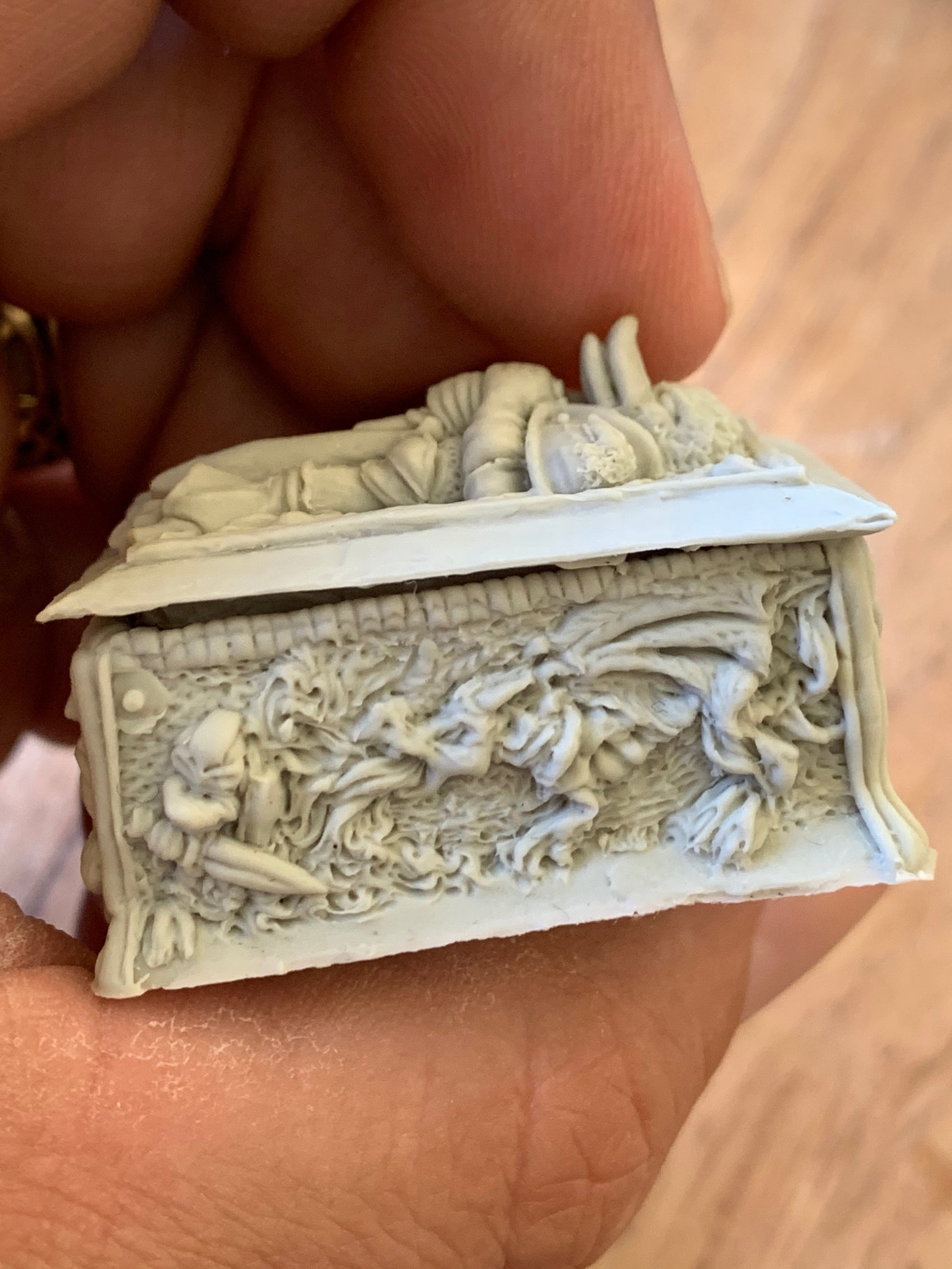 The sarcophagus is 28mm in height and width by 42mm in length. This is a downloadable STL for 3D printing, with a coffin and lid supplied in the zip. Supplied unpainted.