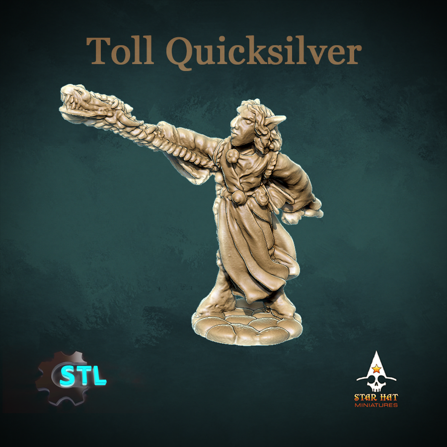 Toll Quicksilver is a downloadable STL for 3D printing, with an integrated cobblestone base and a baseless version supplied in the zip.